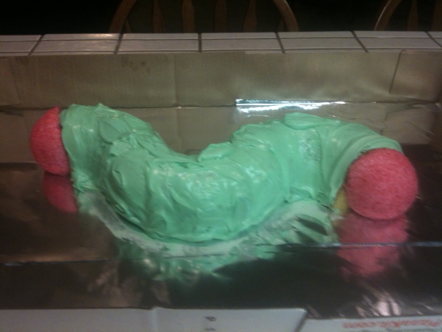 3. Color a regular can of frosting (or frosting recipe) whatever color you'd like your caterpillar to be. Mine was green. Frost the entire cake leaving the two cut ends unfrosted.